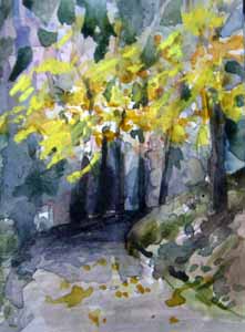 I returned today, after a month's absence, to find my second most favorite tree in Schmitz Preserve Park draped in yellow tape, like a crime scene. I guess it fell victim to rain and wind and its precarious side-of-the-hill perch. In the ten plus years that I've been walking under it, it had grown to provide a wonderful shady canopy, right where the path split.